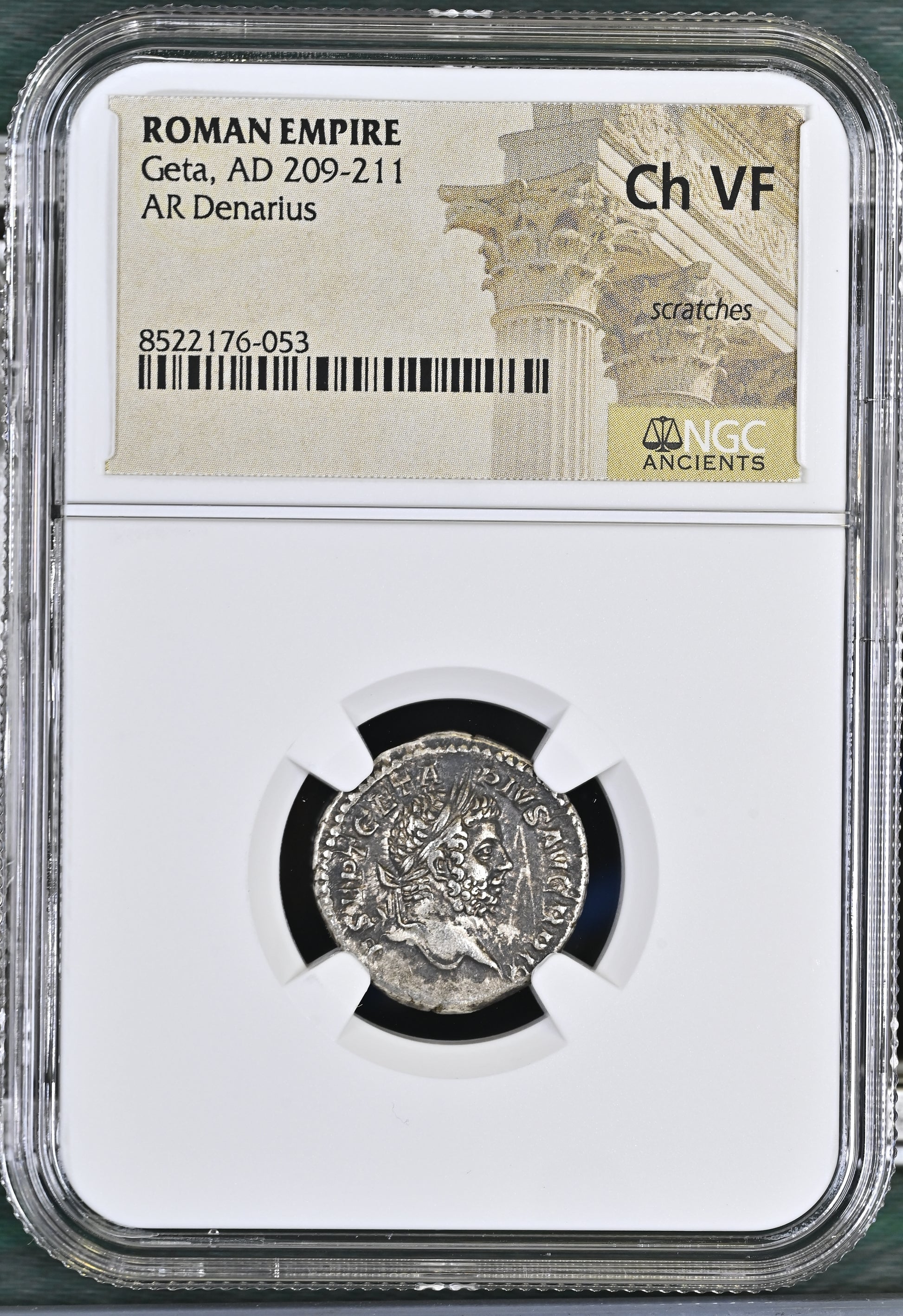 Roman Empire - Geta - Silver Denarius - NGC Ch VF