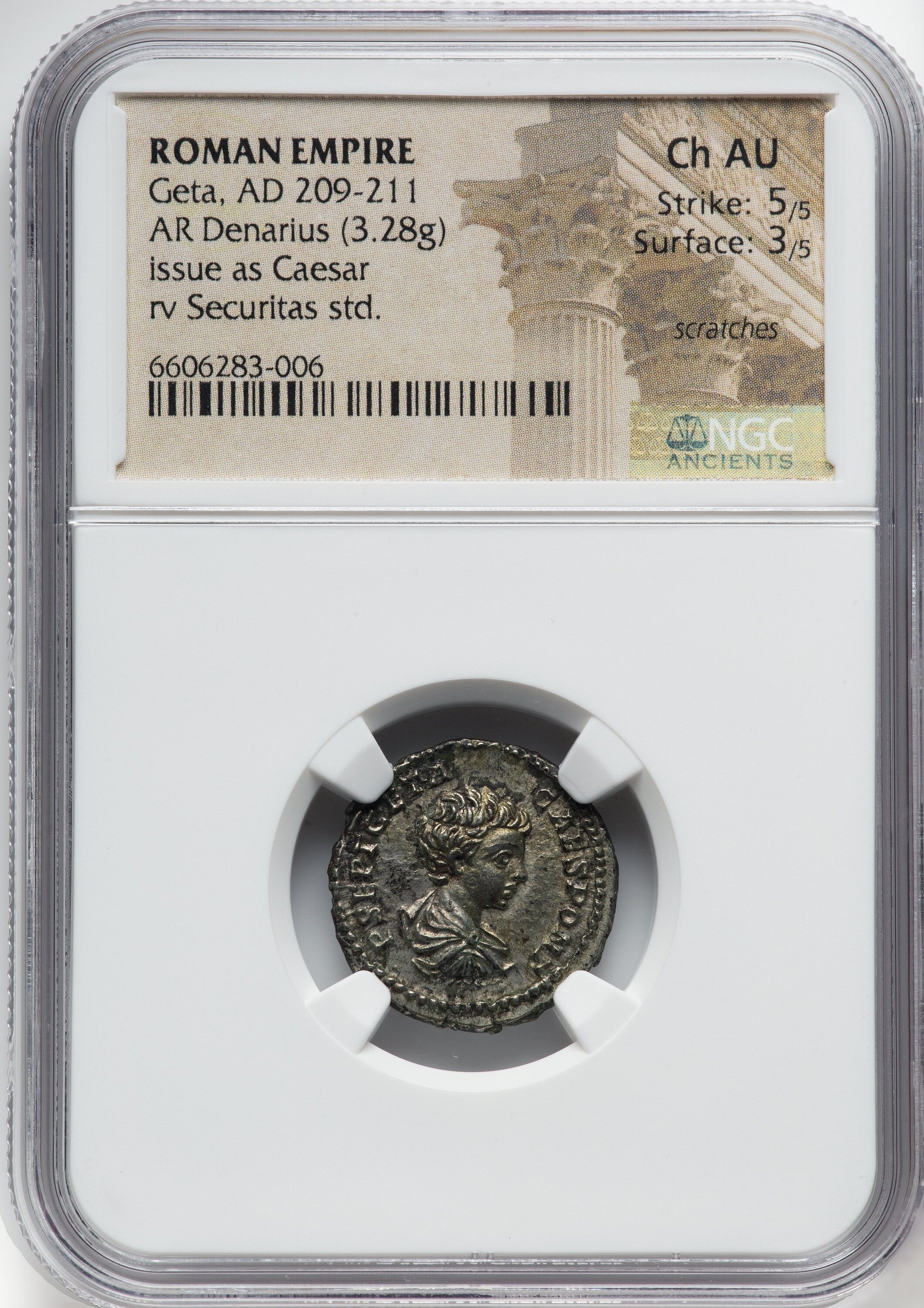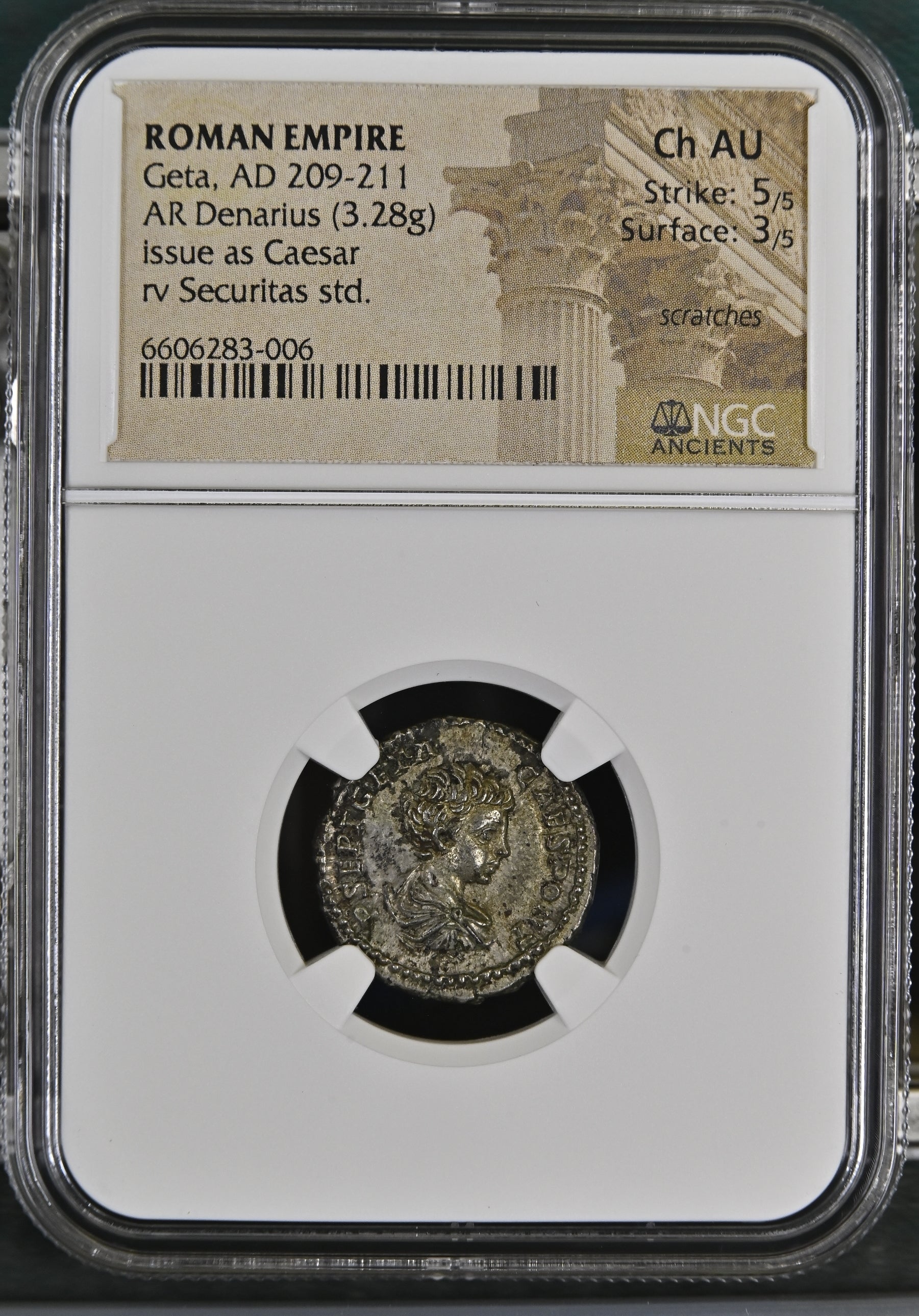 Roman Empire - Geta - Silver Denarius - NGC Ch AU - RIC:20b