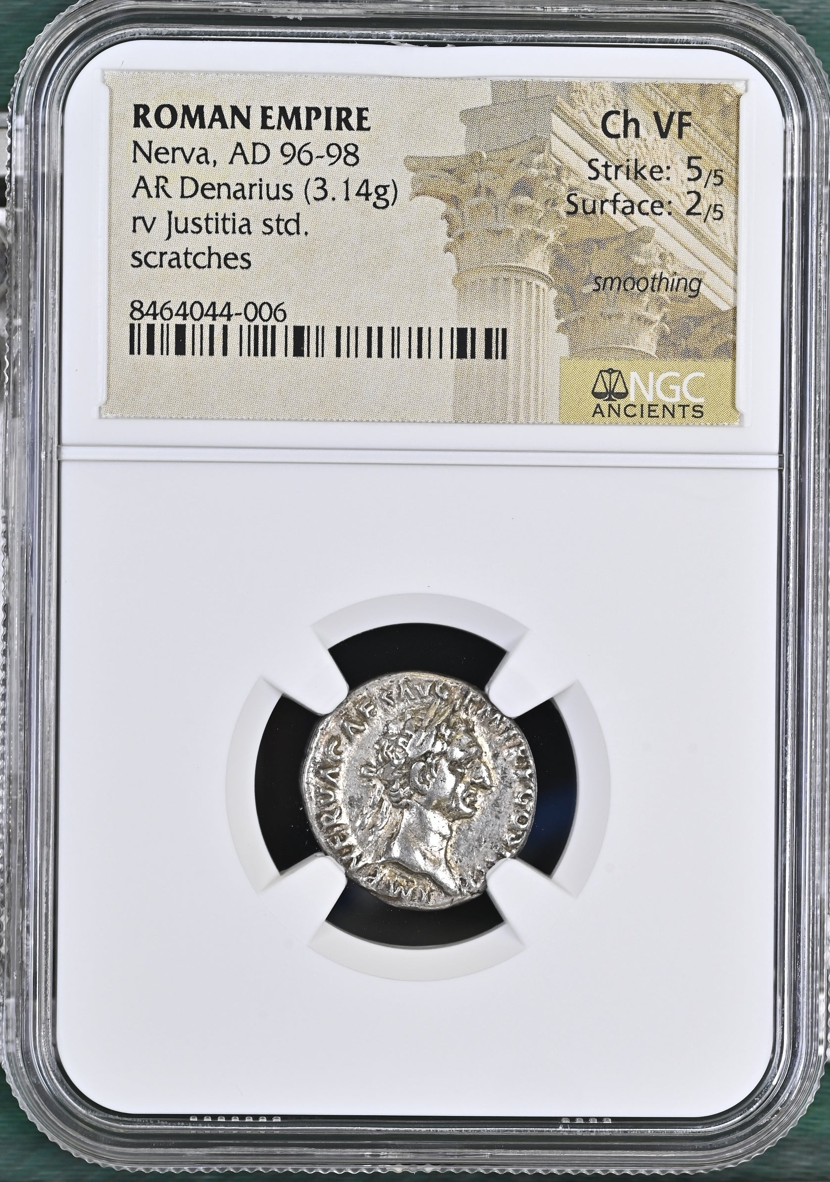 Roman Empire - Nerva - Silver Denarius - NGC Ch VF - RIC:6