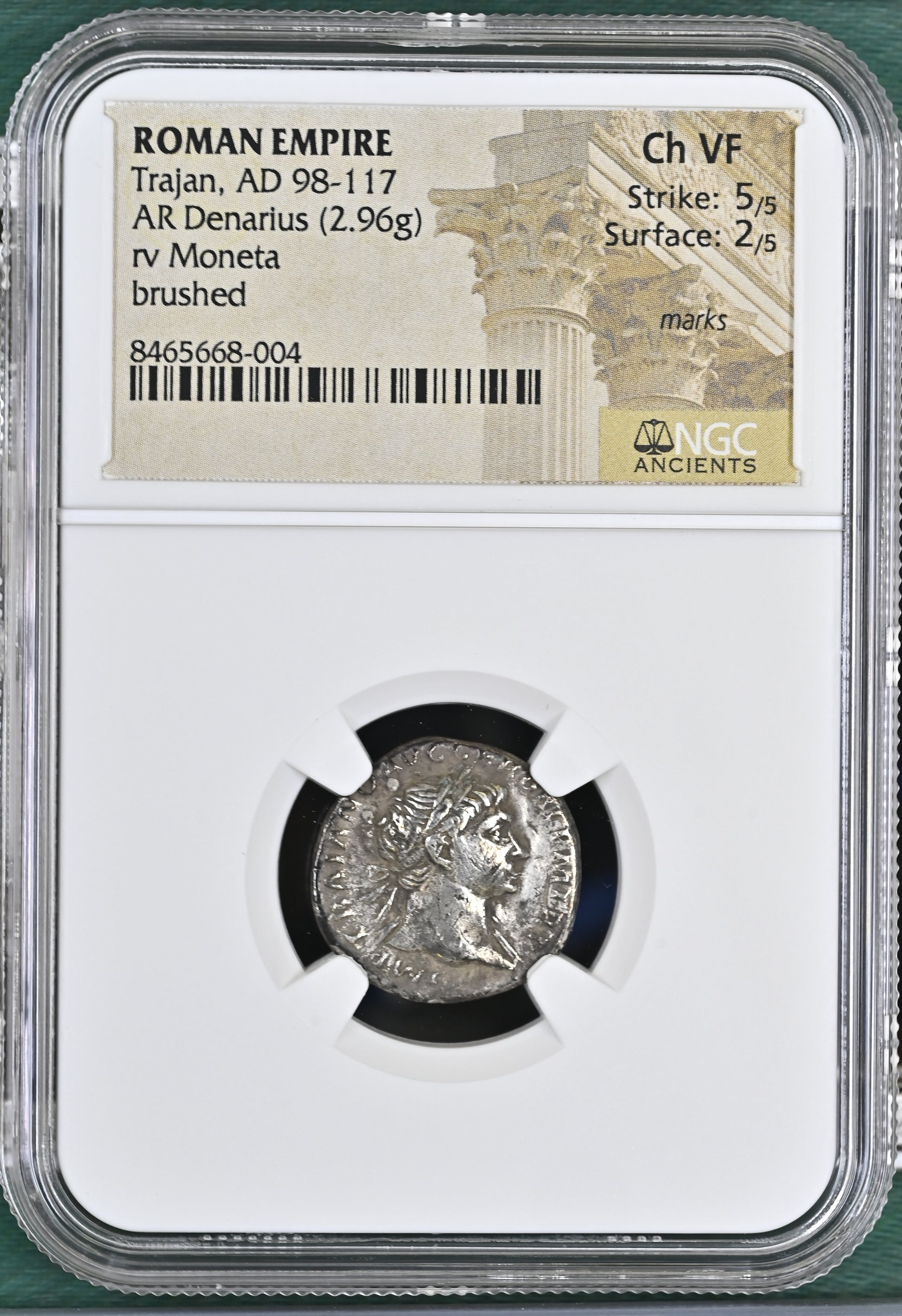 Roman Empire - Trajan - Silver Denarius - NGC Ch VF - RIC:128