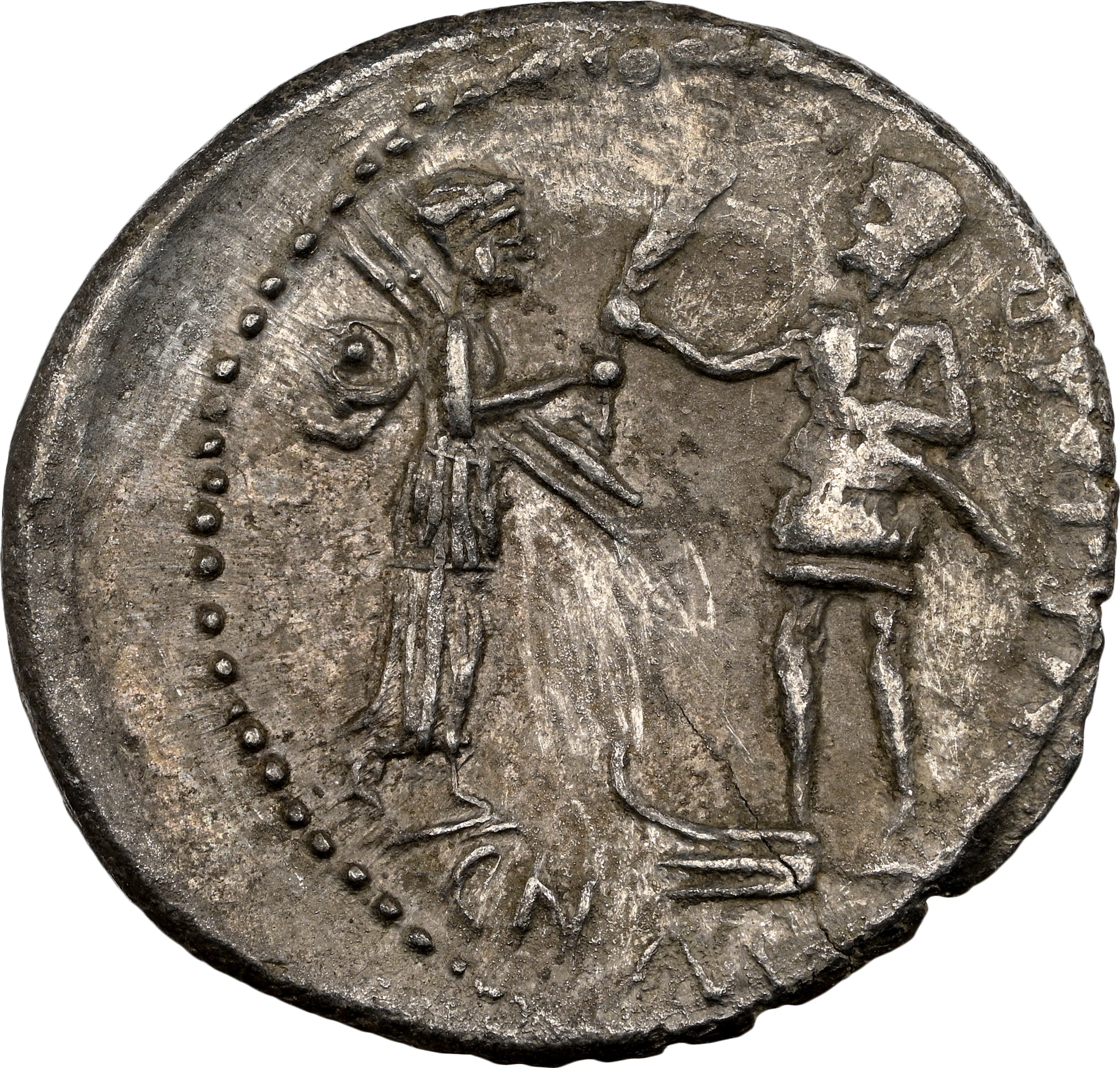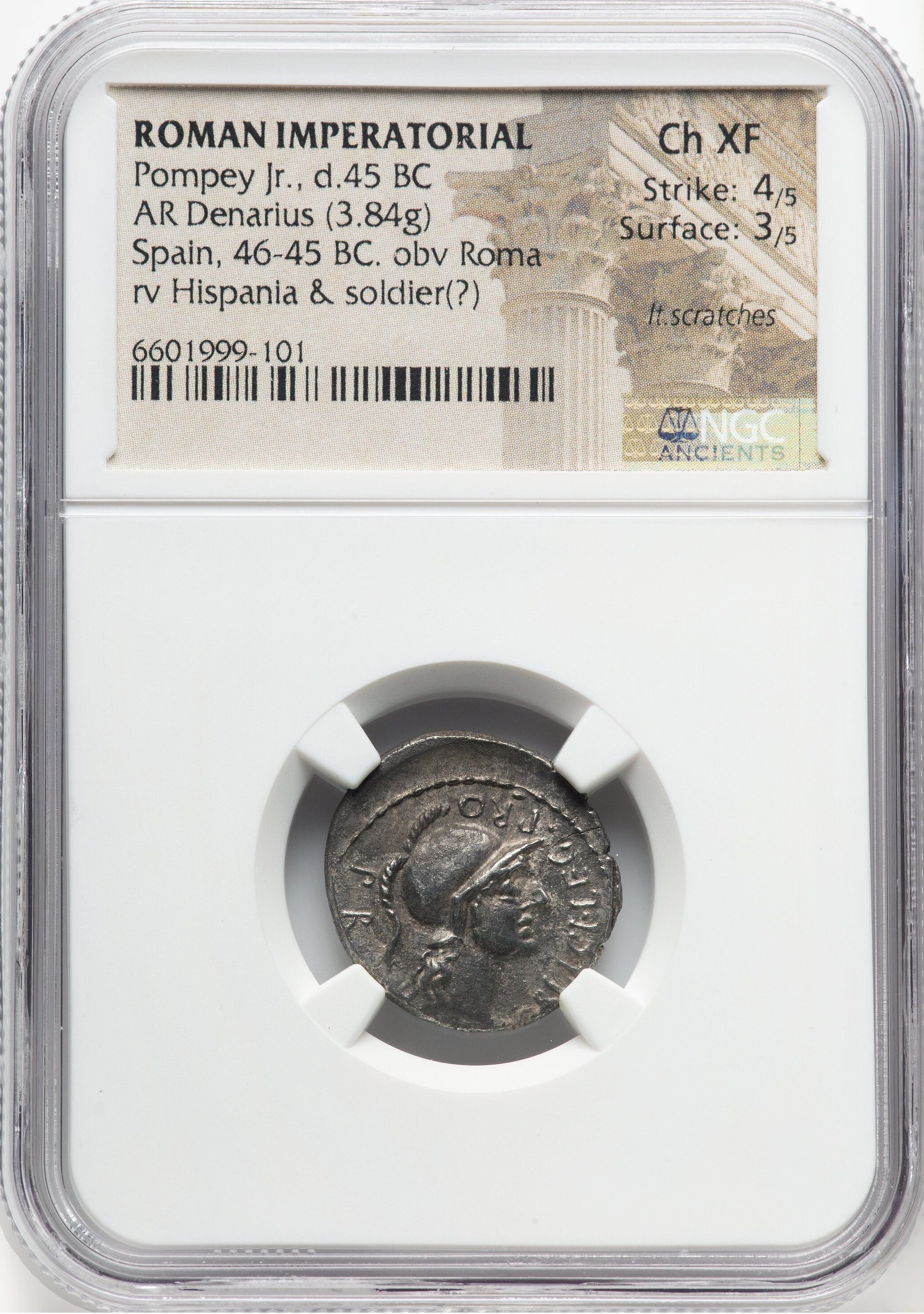 Roman Imperatorial - Pompey Junior - Silver Denarius - NGC Ch XF - Crawf. 469/1a
